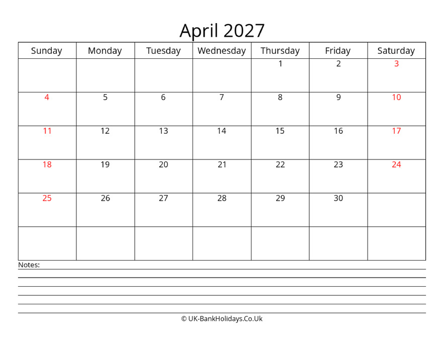Your are downloading April 2027 Uk Calendar With with Notes from website UK Bank Holidays. Please select a format (.docx or pdf) you like to download and print!