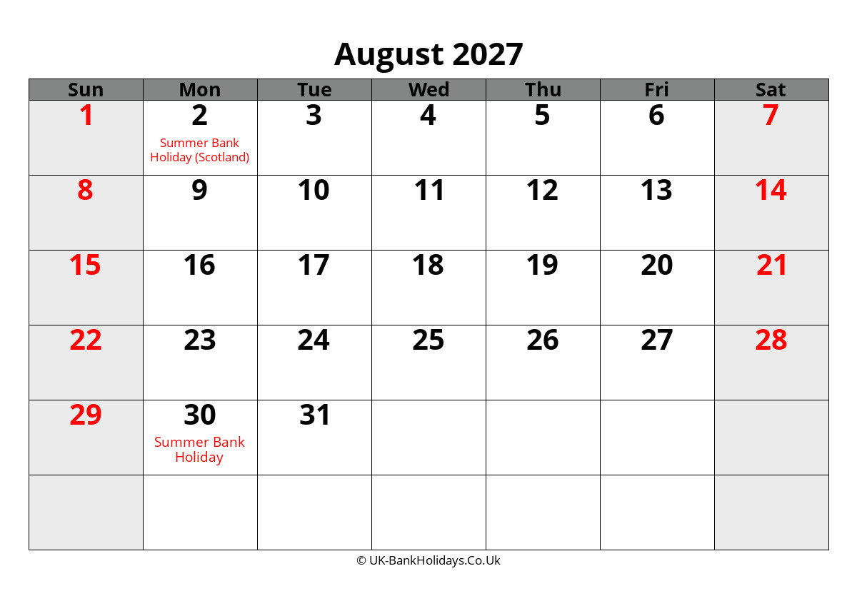 Your are downloading August 2027 Word Uk Calendar from website UK Bank Holidays. Please select a format (.docx or pdf) you like to download and print!