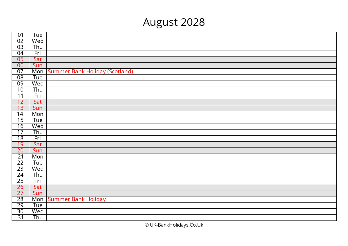 Your are downloading August 2028 Monthly Uk Calendar Free from website UK Bank Holidays. Please select a format (.docx or pdf) you like to download and print!