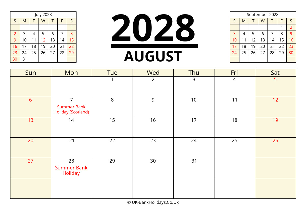 Download August 2028 Printable Uk Calendar