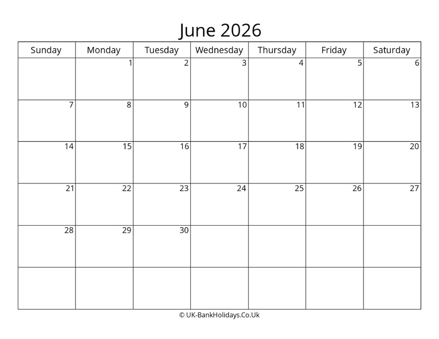 Your are downloading Blank Uk Calendar June 2026 from website UK Bank Holidays. Please select a format (.docx or pdf) you like to download and print!