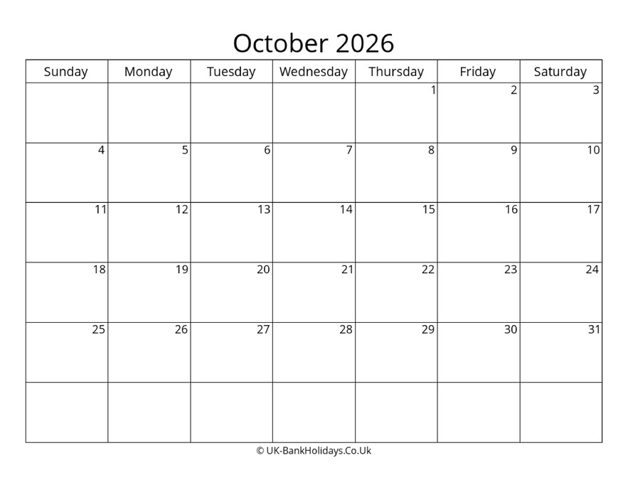 Your are downloading Blank Uk Calendar October 2026 from website UK Bank Holidays. Please select a format (.docx or pdf) you like to download and print!
