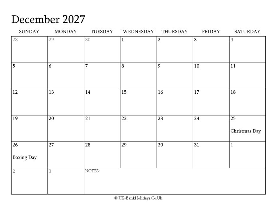 Your are downloading December 2027 Editable Uk Calendar With with Holidays from website UK Bank Holidays. Please select a format (.docx or pdf) you like to download and print!