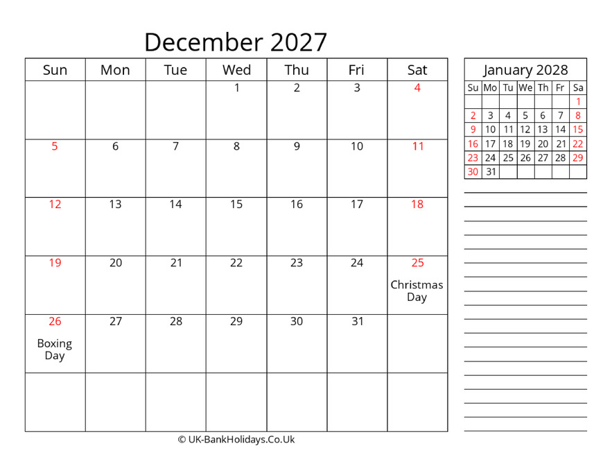Your are downloading December 2027 Uk Calendar Template from website UK Bank Holidays. Please select a format (.docx or pdf) you like to download and print!