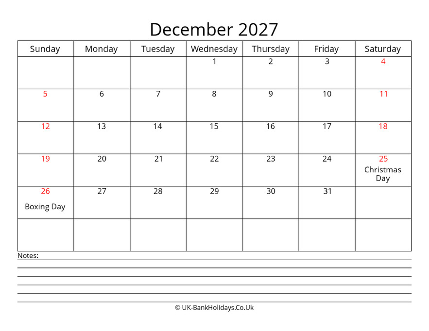 Download December 2027 Uk Calendar With with Notes