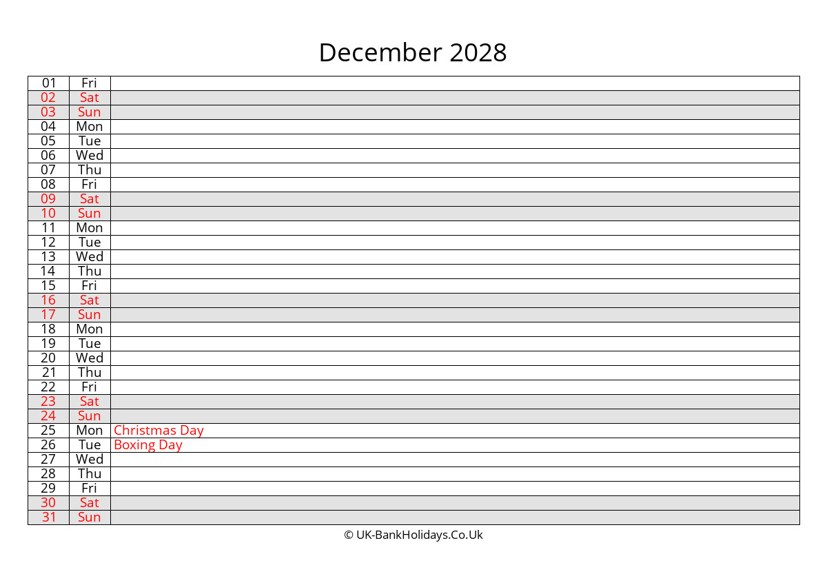 Your are downloading December 2028 Monthly Uk Calendar Free from website UK Bank Holidays. Please select a format (.docx or pdf) you like to download and print!