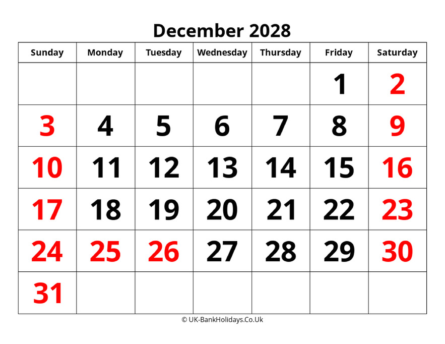 Your are downloading December 2028 Pdf Uk Calendar from website UK Bank Holidays. Please select a format (.docx or pdf) you like to download and print!