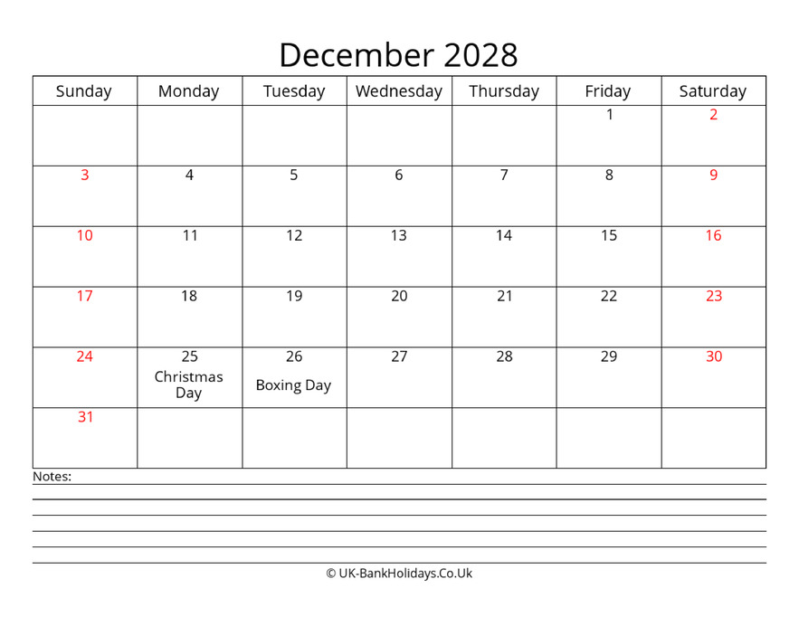 Your are downloading December 2028 Uk Calendar With with Notes from website UK Bank Holidays. Please select a format (.docx or pdf) you like to download and print!