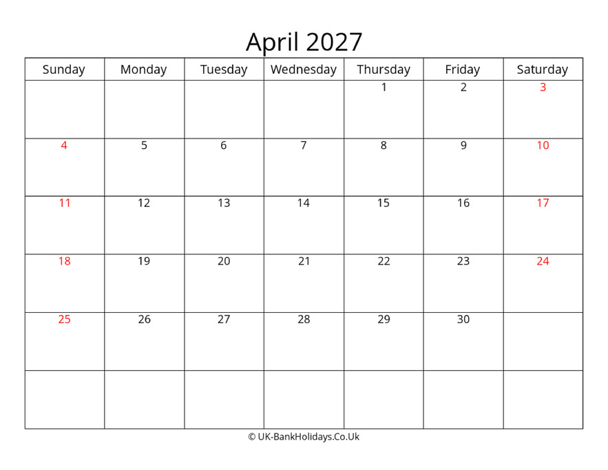 Your are downloading Editable April 2027 Monthly Uk Calendar from website UK Bank Holidays. Please select a format (.docx or pdf) you like to download and print!