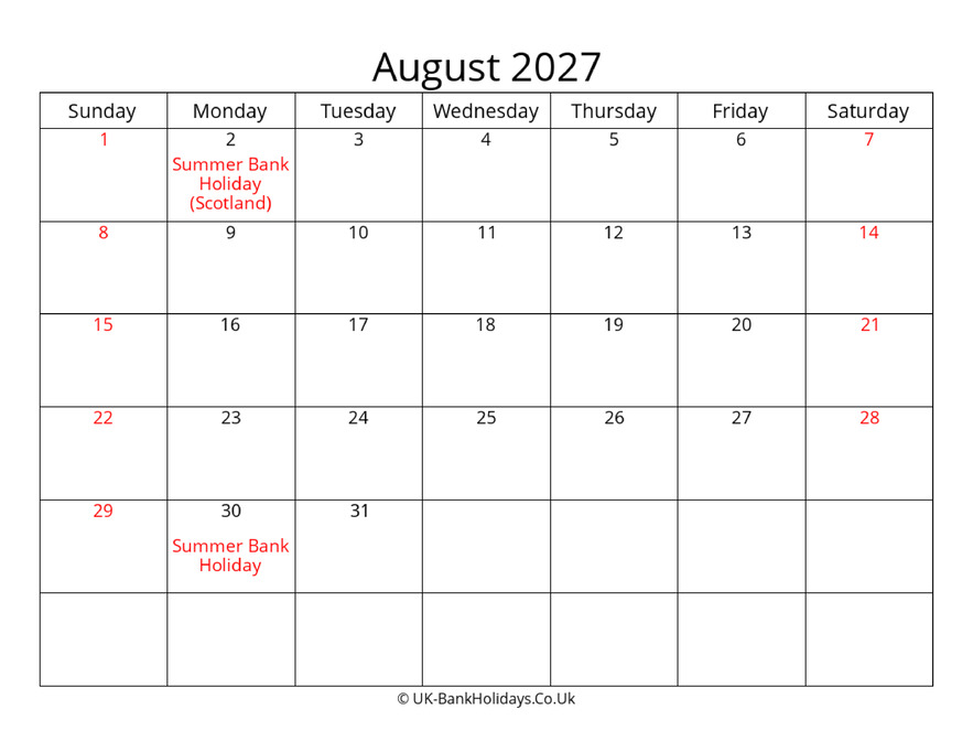 Your are downloading Editable August 2027 Monthly Uk Calendar from website UK Bank Holidays. Please select a format (.docx or pdf) you like to download and print!