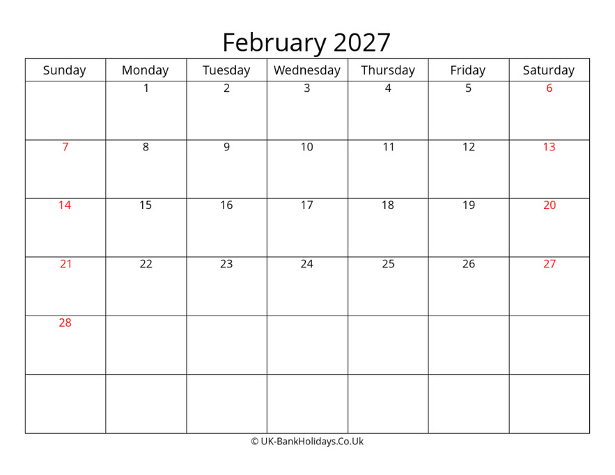 Your are downloading Editable February 2027 Monthly Uk Calendar from website UK Bank Holidays. Please select a format (.docx or pdf) you like to download and print!