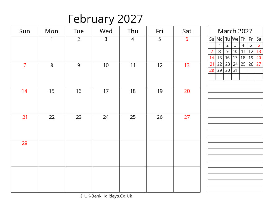 Your are downloading February 2027 Uk Calendar Template from website UK Bank Holidays. Please select a format (.docx or pdf) you like to download and print!