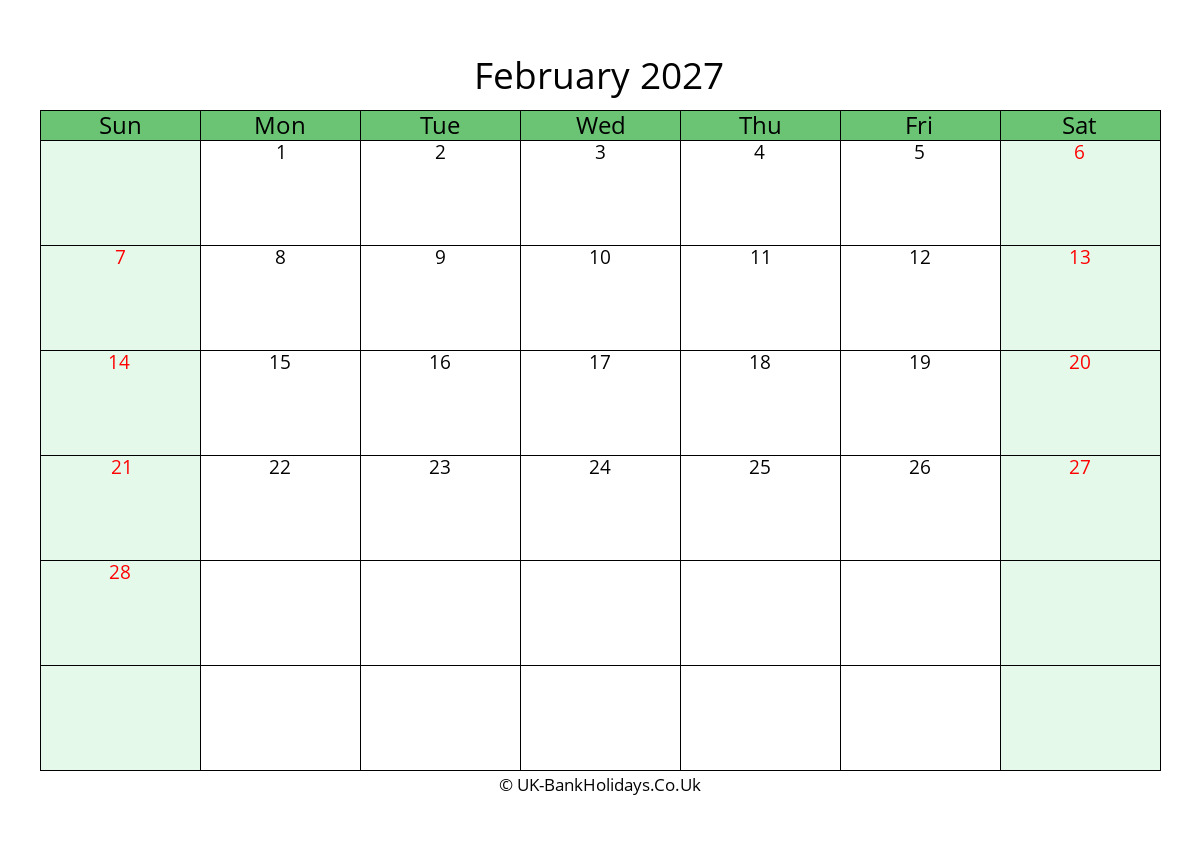Download February 2027 Uk Calendar To Print