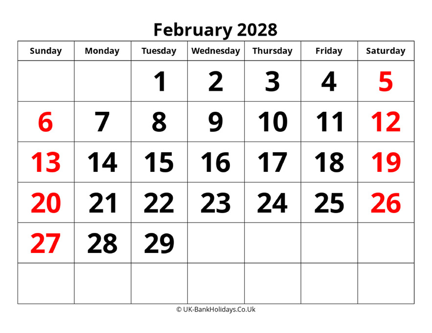 Your are downloading February 2028 Pdf Uk Calendar from website UK Bank Holidays. Please select a format (.docx or pdf) you like to download and print!