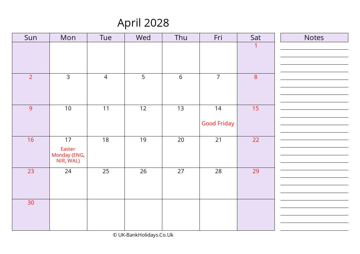 Download Free Printable April 2028 Uk Calendar