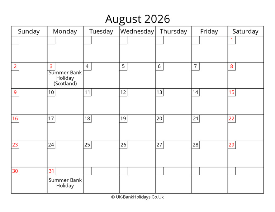 Your are downloading Free Printable Uk Calendar August 2026 from website UK Bank Holidays. Please select a format (.docx or pdf) you like to download and print!