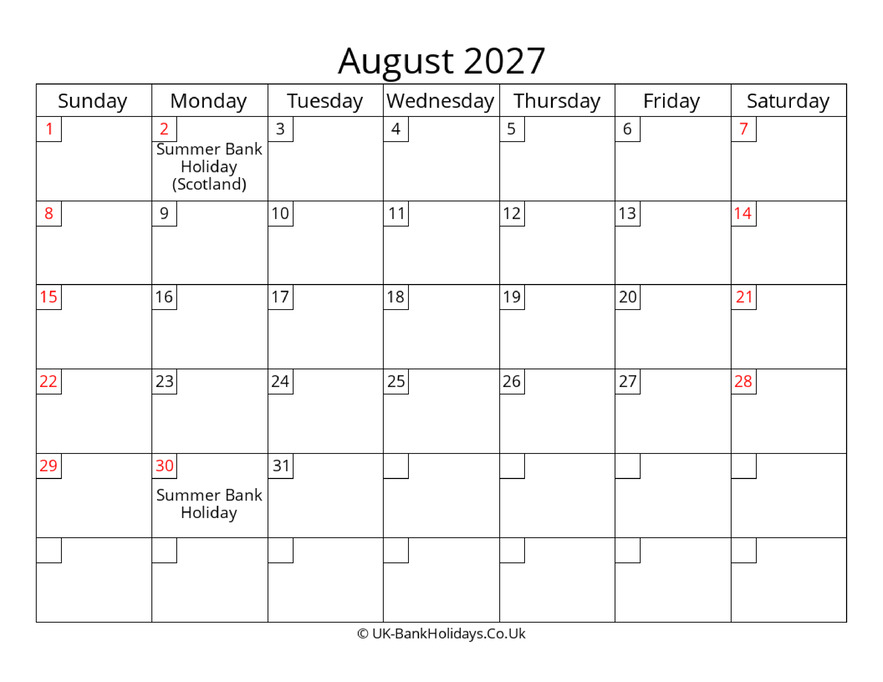 Download Free Printable Uk Calendar August 2027