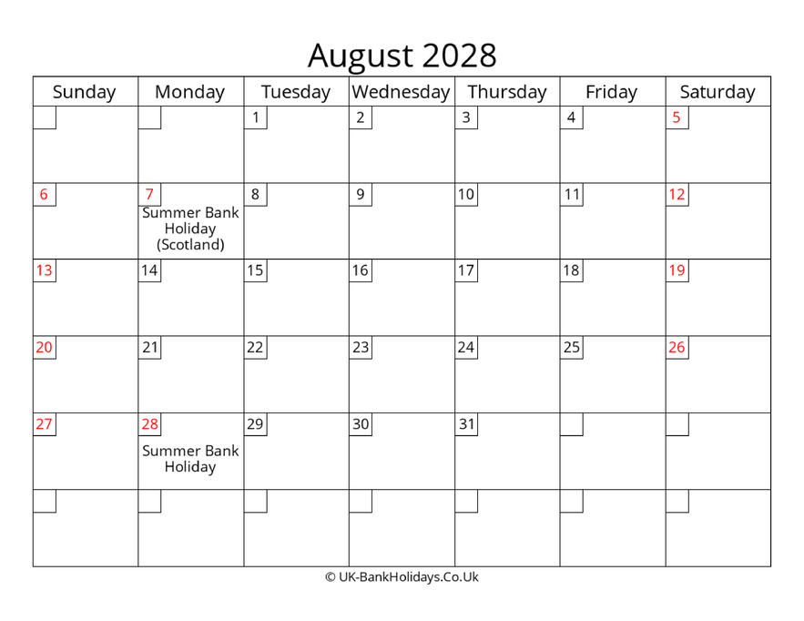Your are downloading Free Printable Uk Calendar August 2028 from website UK Bank Holidays. Please select a format (.docx or pdf) you like to download and print!
