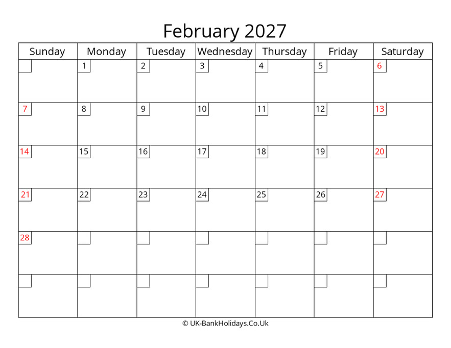 Download Free Printable Uk Calendar February 2027