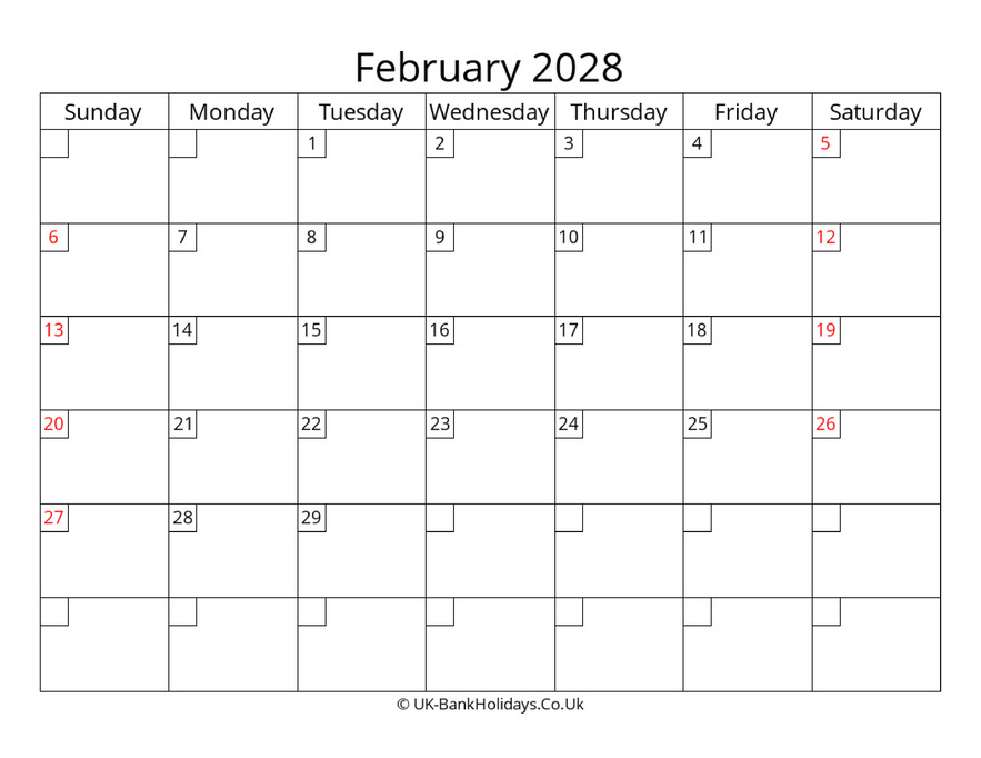 Download Free Printable Uk Calendar February 2028