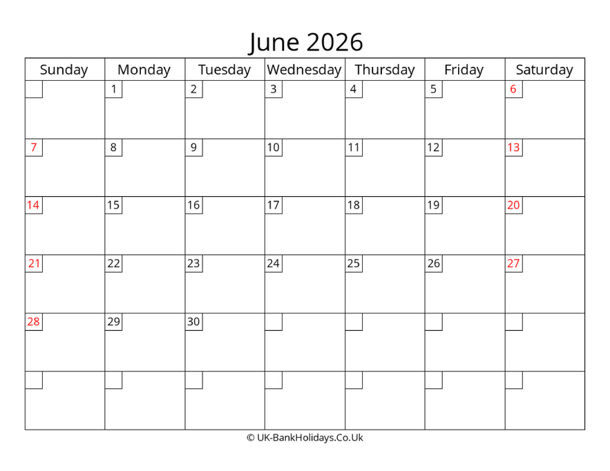 Your are downloading Free Printable Uk Calendar June 2026 from website UK Bank Holidays. Please select a format (.docx or pdf) you like to download and print!