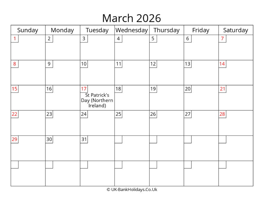 Your are downloading Free Printable Uk Calendar March 2026 from website UK Bank Holidays. Please select a format (.docx or pdf) you like to download and print!