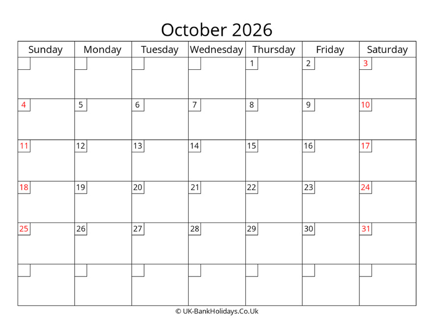 Your are downloading Free Printable Uk Calendar October 2026 from website UK Bank Holidays. Please select a format (.docx or pdf) you like to download and print!