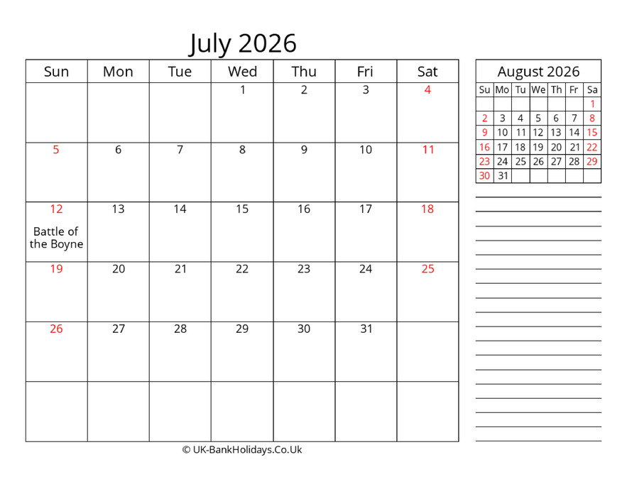 Your are downloading July 2026 Uk Calendar Template from website UK Bank Holidays. Please select a format (.docx or pdf) you like to download and print!