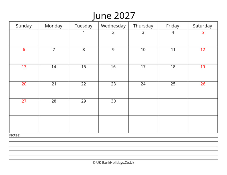 Your are downloading June 2027 Uk Calendar With with Notes from website UK Bank Holidays. Please select a format (.docx or pdf) you like to download and print!