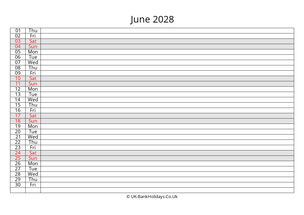 Your are downloading June 2028 Monthly Uk Calendar Free from website UK Bank Holidays. Please select a format (.docx or pdf) you like to download and print!