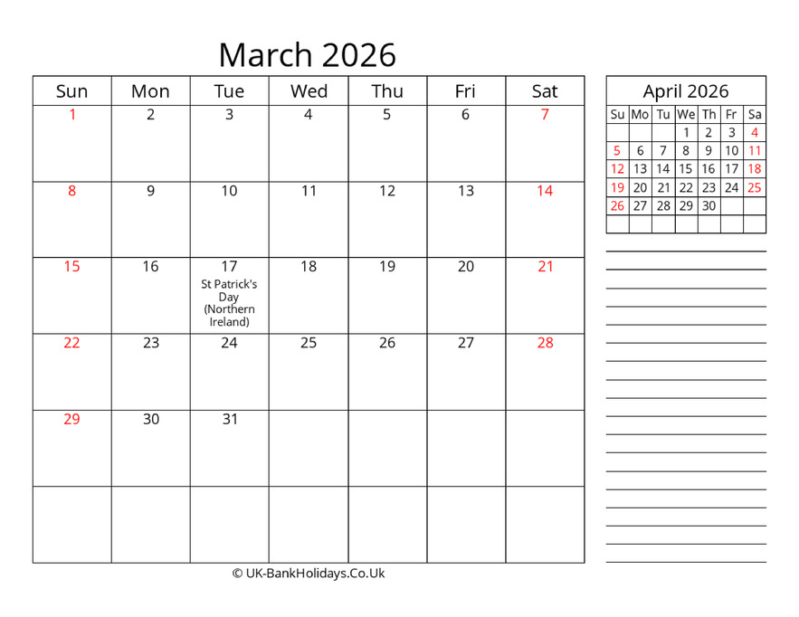 Your are downloading March 2026 Uk Calendar Template from website UK Bank Holidays. Please select a format (.docx or pdf) you like to download and print!
