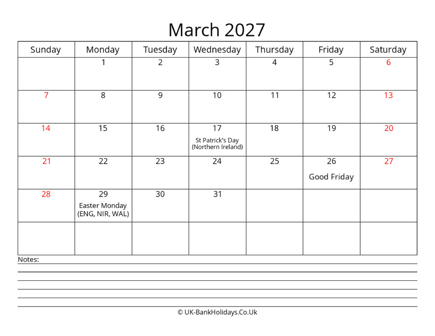 Download March 2027 Uk Calendar With with Notes