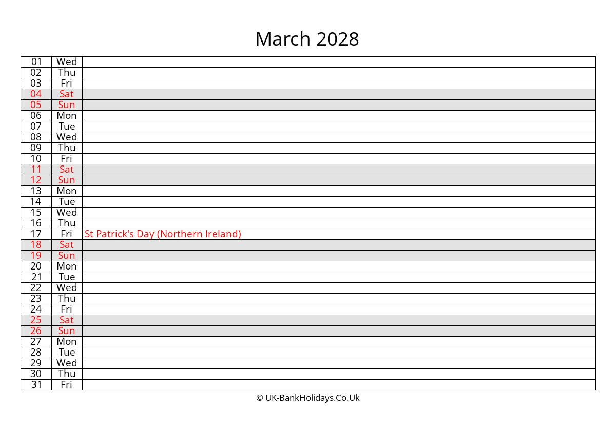 Your are downloading March 2028 Monthly Uk Calendar Free from website UK Bank Holidays. Please select a format (.docx or pdf) you like to download and print!