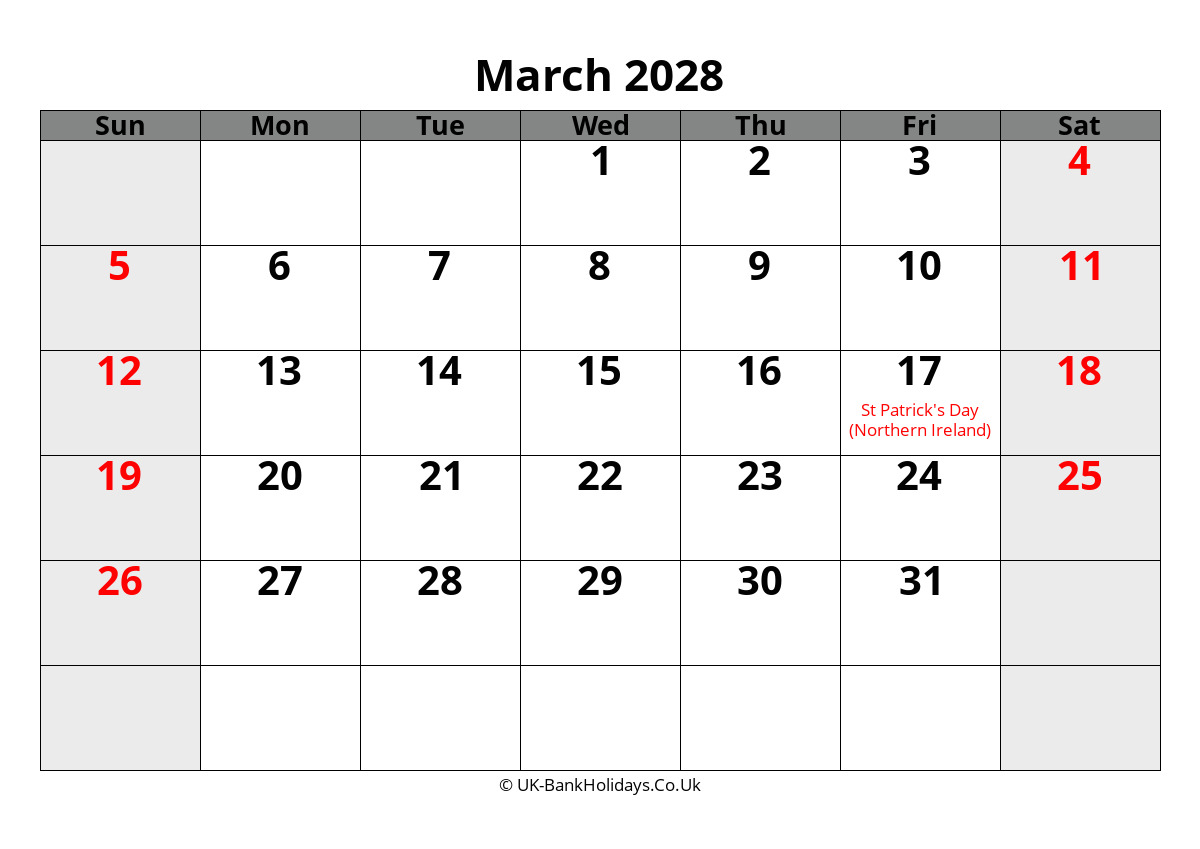 Your are downloading March 2028 Word Uk Calendar from website UK Bank Holidays. Please select a format (.docx or pdf) you like to download and print!