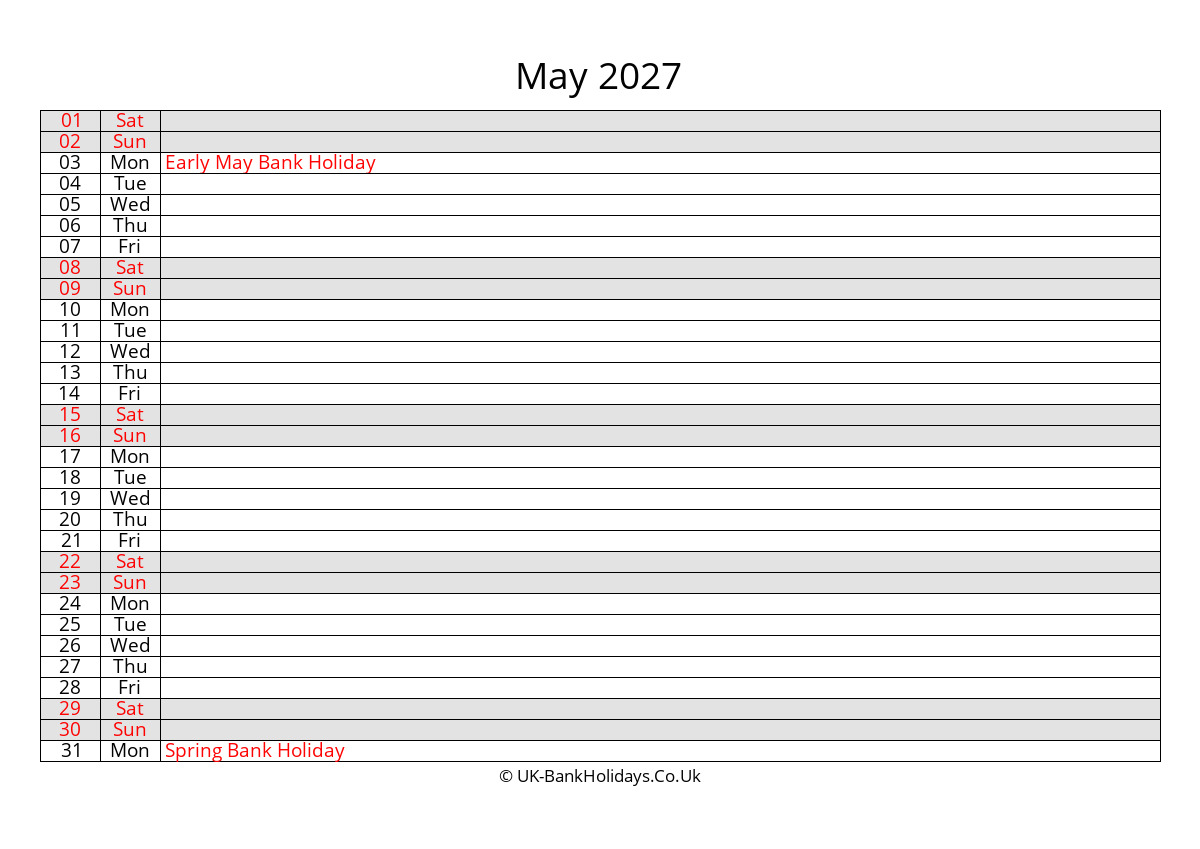 Your are downloading May 2027 Monthly Uk Calendar Free from website UK Bank Holidays. Please select a format (.docx or pdf) you like to download and print!