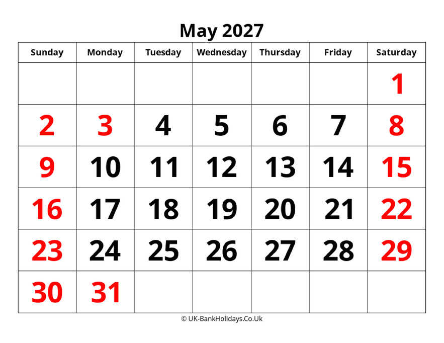 Your are downloading May 2027 Pdf Uk Calendar from website UK Bank Holidays. Please select a format (.docx or pdf) you like to download and print!