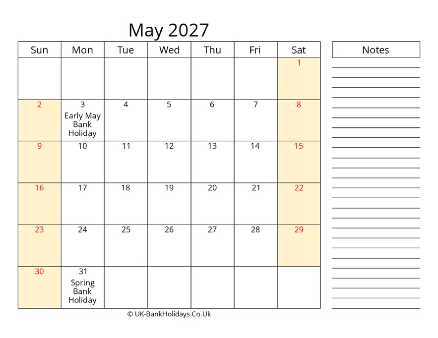 Your are downloading May 2027 Uk Calendar That Work from website UK Bank Holidays. Please select a format (.docx or pdf) you like to download and print!