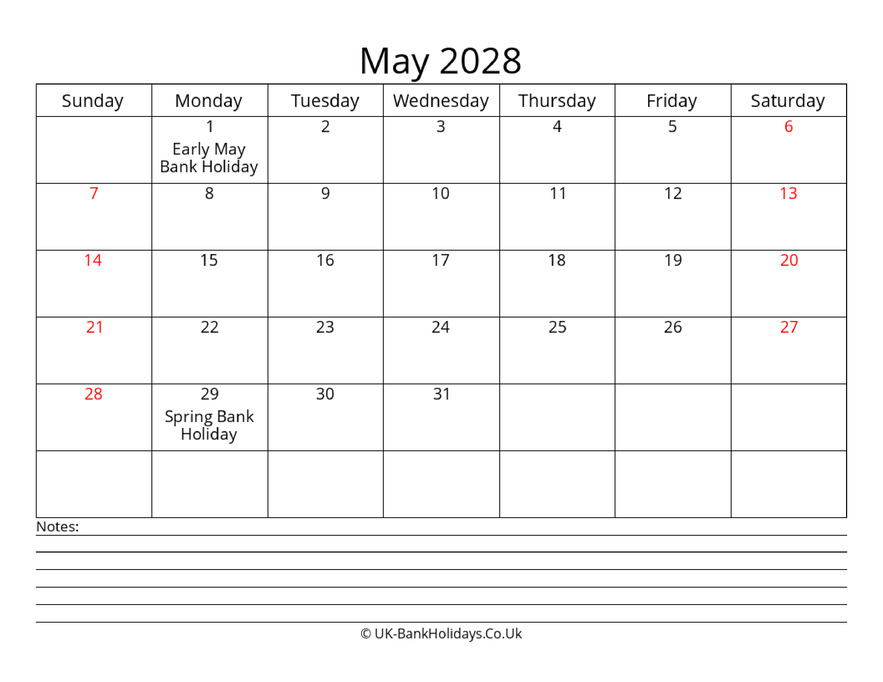 Download May 2028 Uk Calendar With with Notes