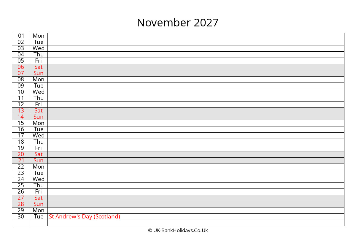 Download November 2027 Monthly Uk Calendar Free