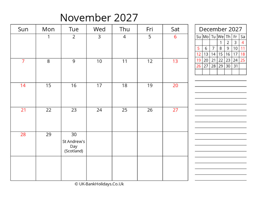 Your are downloading November 2027 Uk Calendar Template from website UK Bank Holidays. Please select a format (.docx or pdf) you like to download and print!
