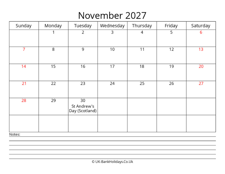 Download November 2027 Uk Calendar With with Notes