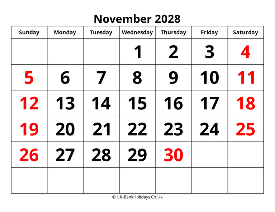 Your are downloading November 2028 Pdf Uk Calendar from website UK Bank Holidays. Please select a format (.docx or pdf) you like to download and print!