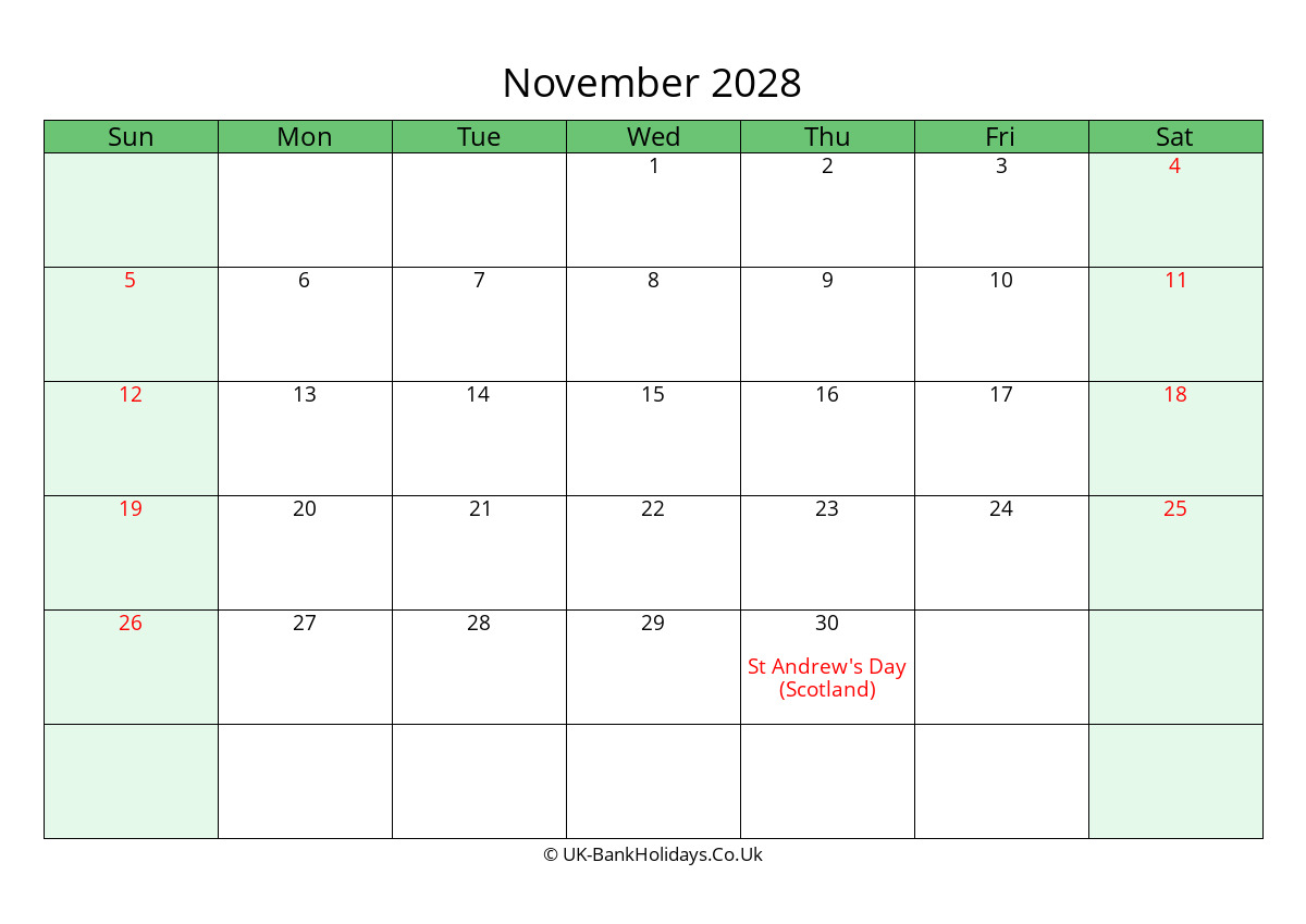 Your are downloading November 2028 Uk Calendar To Print from website UK Bank Holidays. Please select a format (.docx or pdf) you like to download and print!