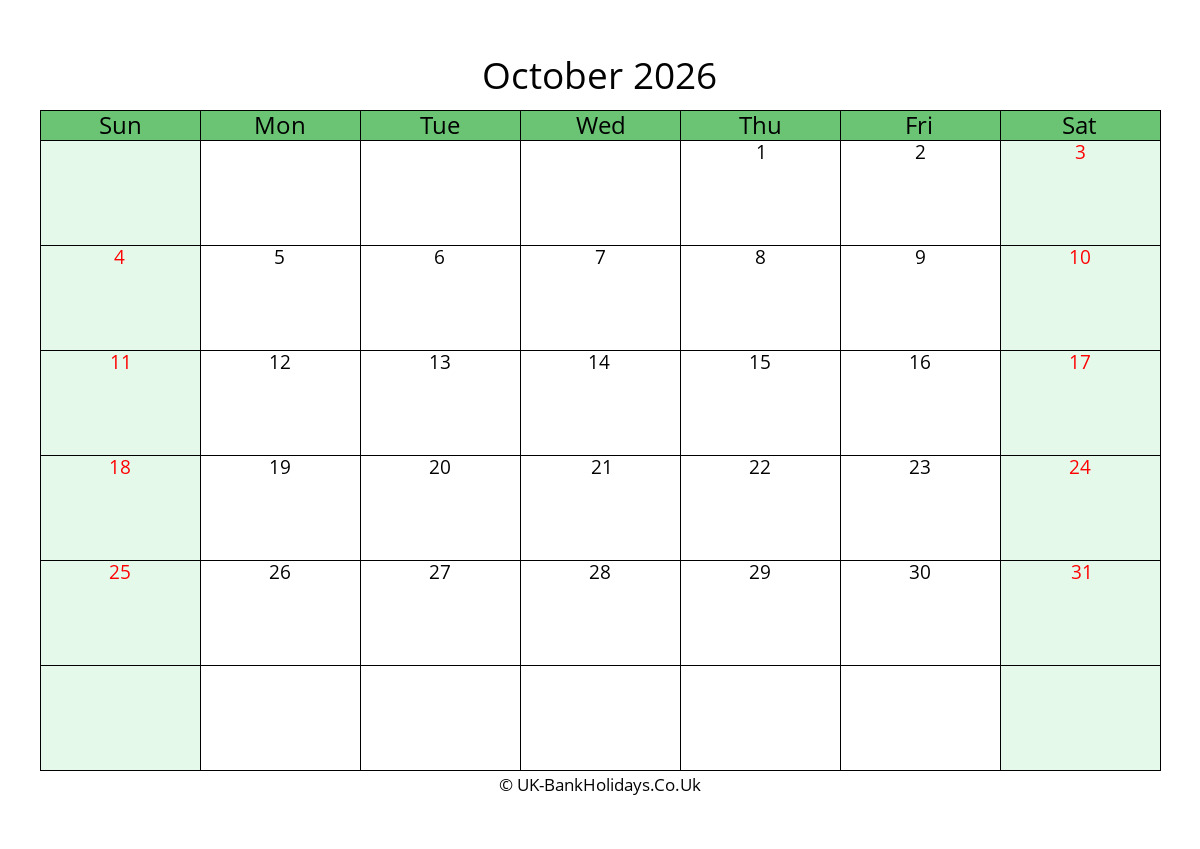 Your are downloading October 2026 Uk Calendar To Print from website UK Bank Holidays. Please select a format (.docx or pdf) you like to download and print!