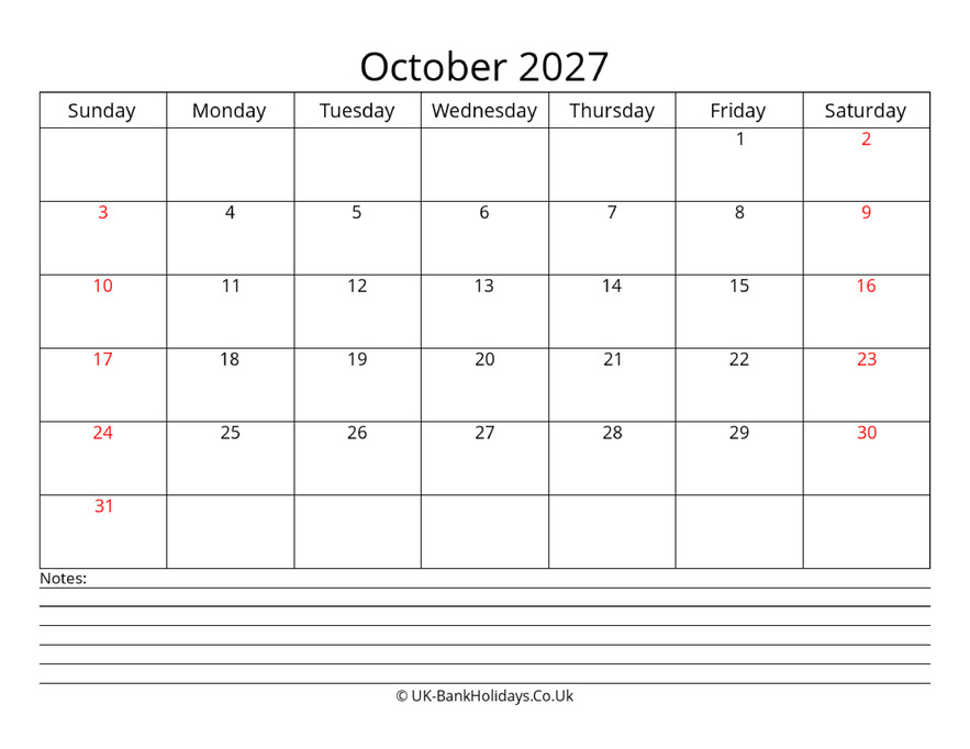 Your are downloading October 2027 Uk Calendar With with Notes from website UK Bank Holidays. Please select a format (.docx or pdf) you like to download and print!