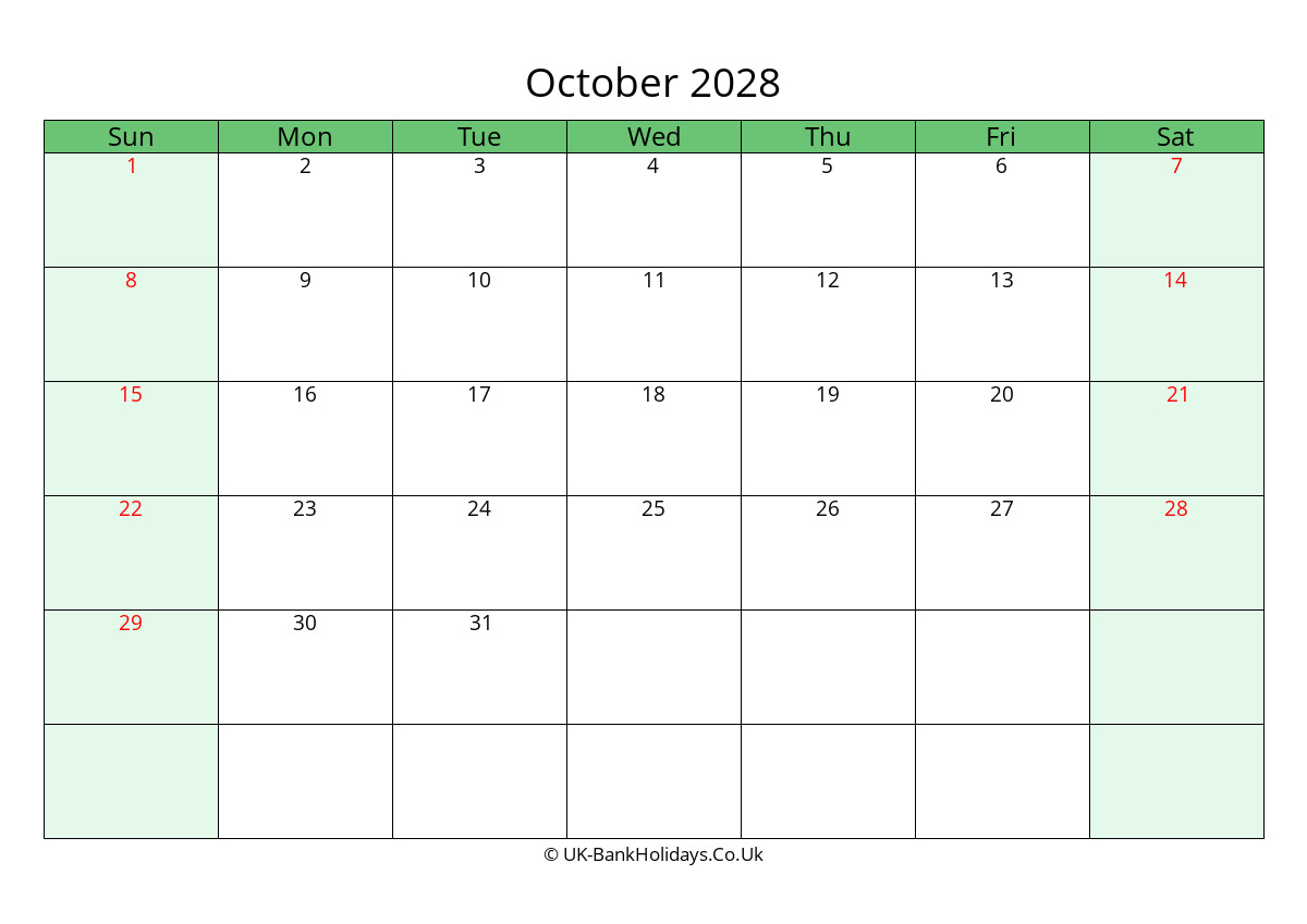 Your are downloading October 2028 Uk Calendar To Print from website UK Bank Holidays. Please select a format (.docx or pdf) you like to download and print!