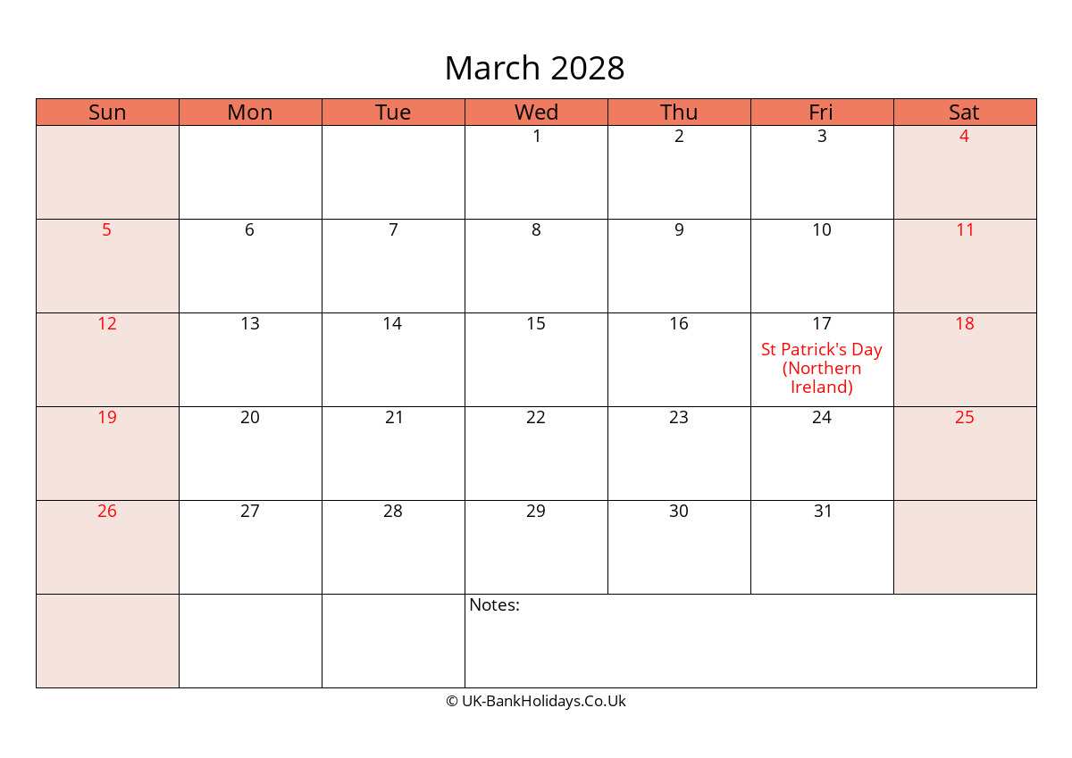 Your are downloading Print A Uk Calendar March 2028 from website UK Bank Holidays. Please select a format (.docx or pdf) you like to download and print!