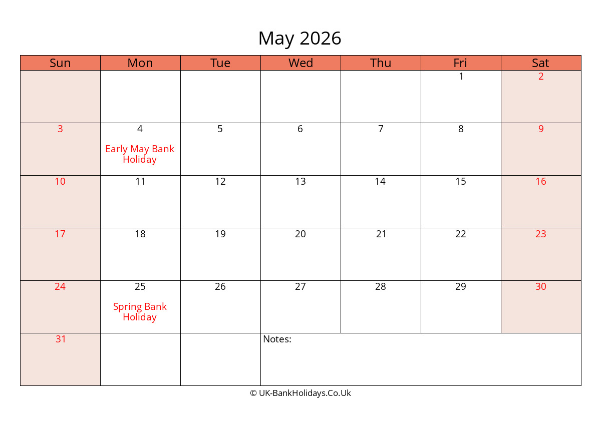Your are downloading Print A Uk Calendar May 2026 from website UK Bank Holidays. Please select a format (.docx or pdf) you like to download and print!