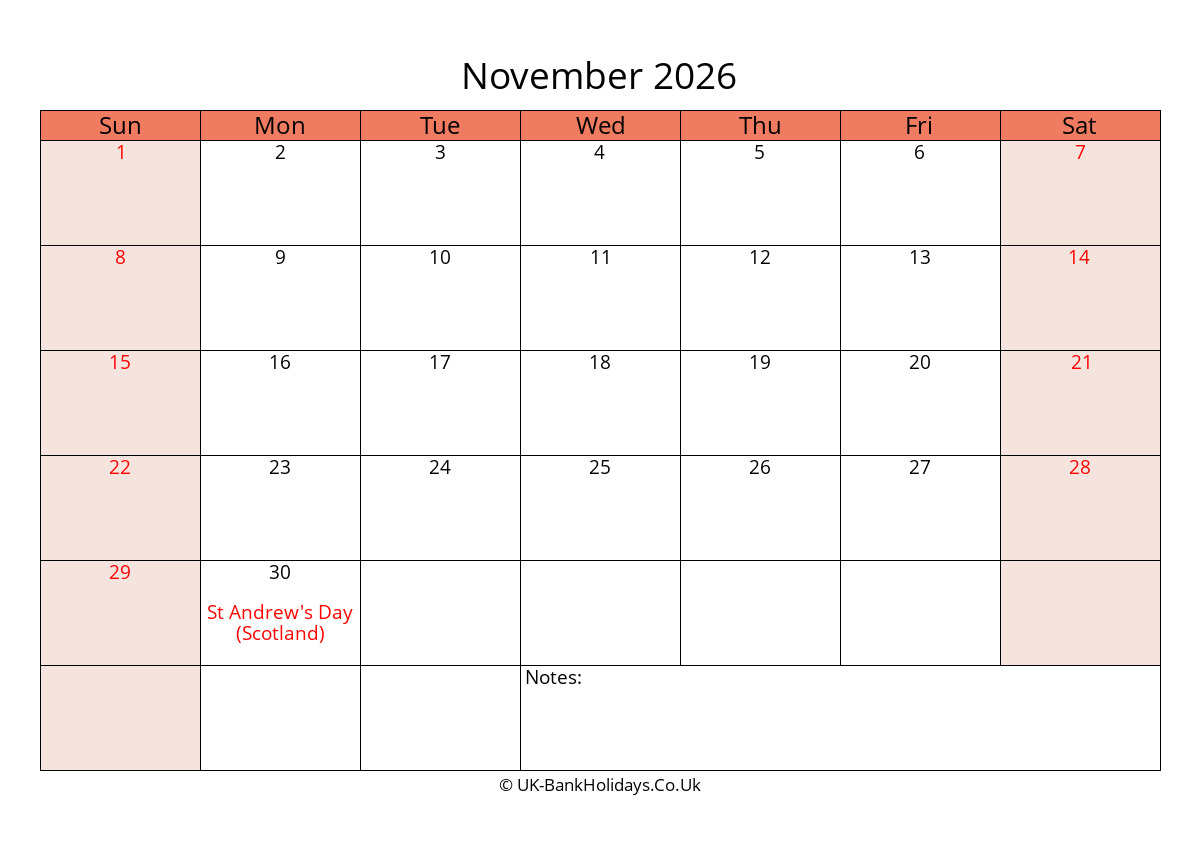 Your are downloading Print A Uk Calendar November 2026 from website UK Bank Holidays. Please select a format (.docx or pdf) you like to download and print!