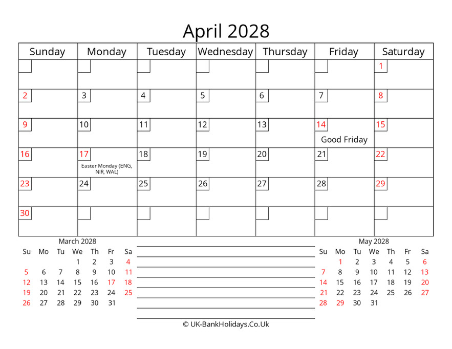 Download Printable Monthly Uk Calendar April 2028